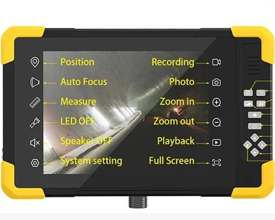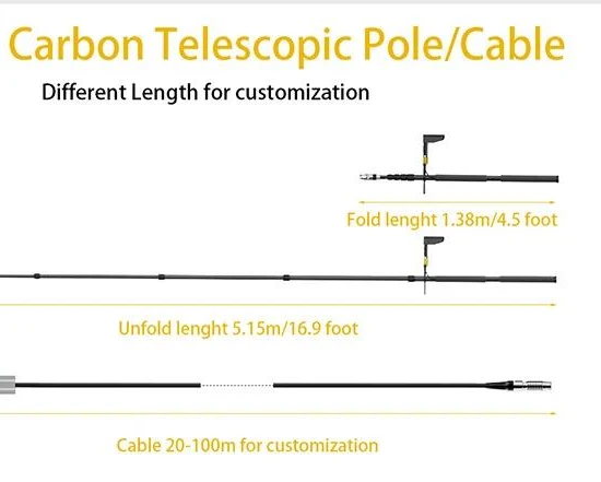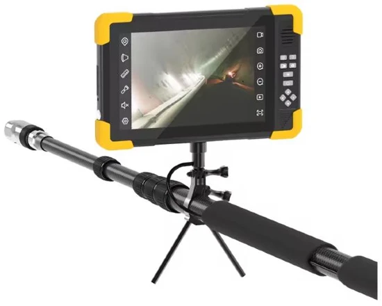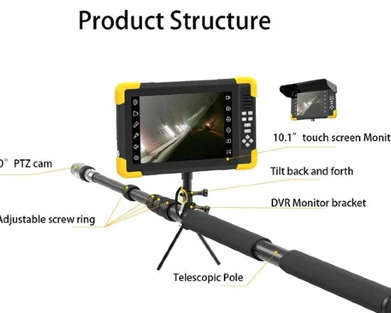The viewing angle is 135° with light source of 8 LED or IR lamp, Audio communication, telescopic pole camera of 10m (unfolded), 1.13m (folded).